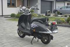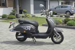 Stan wizualny: Skuter prezentuje się atrakcyjnie, posiada charakterystyczne naklejki ("płomienie/czaszka") na boku oraz chromowane dodatki (kierownica, relingi). Wyposażony jest w wygodne oparcie dla pasażera. Posiada normalne ślady użytkowania adekwatne do rocznika. Jest wyposażony w podnóżek dla pasażera oraz stopkę boczna